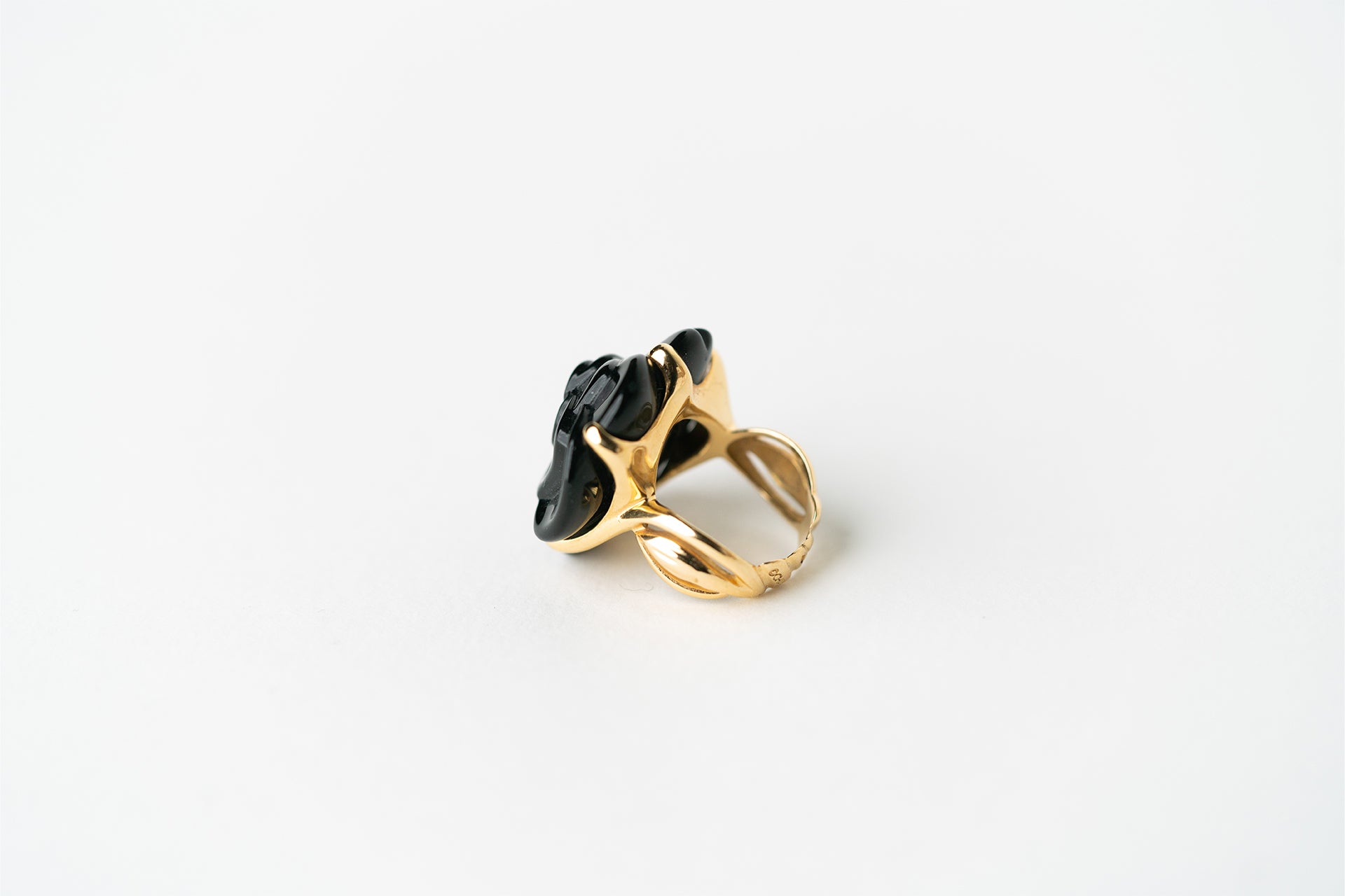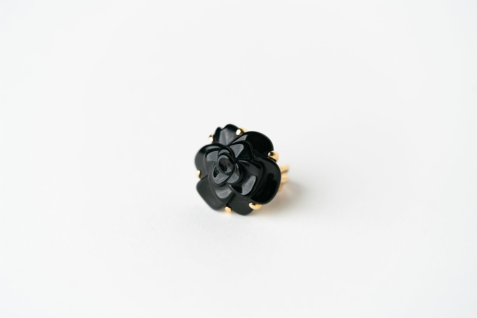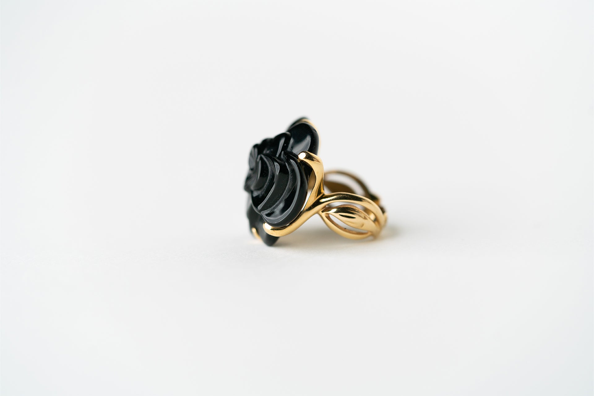 A ring features onyx perfectly carved into the iconic Camélia of the House of Chanel and mounted in 18ct gold shaped into an elegant twisting stem.