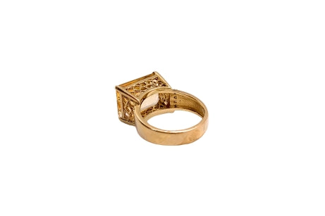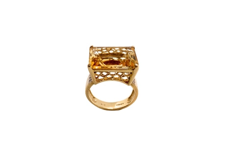 A large emerald cut Citrine set in a latticed gold mount, flanked by four individual brilliant cut diamonds on either side.