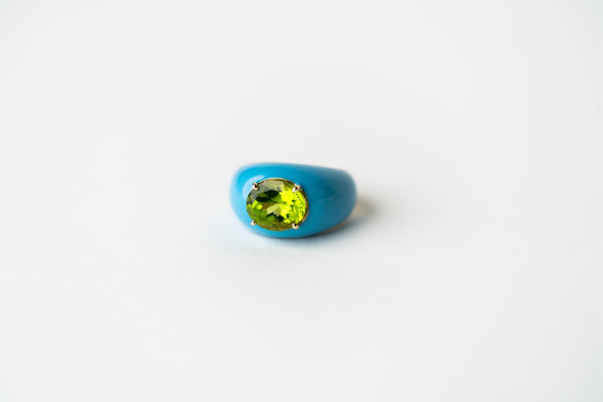 Green oval peridot set in blue Italian enamel and recycled yellow gold. A Knightsbridge Rocks original one of a kind ring from our Roma collection. Made in Italy.